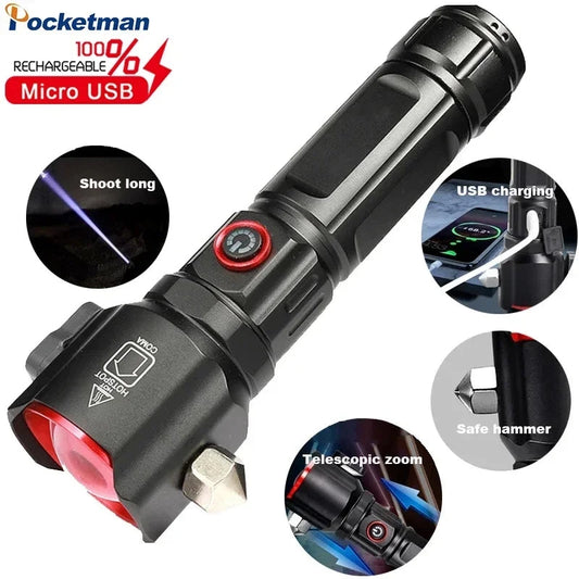 Multi-functional Rechargeable High Power LED Flashlight with Emergency Hammer. Material: aluminum alloy Lamp bead model: LED About...