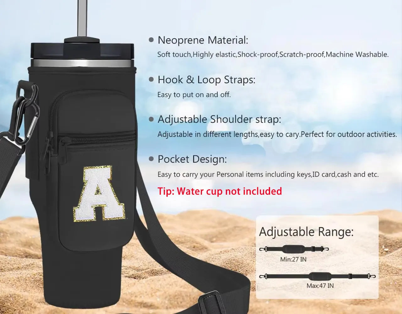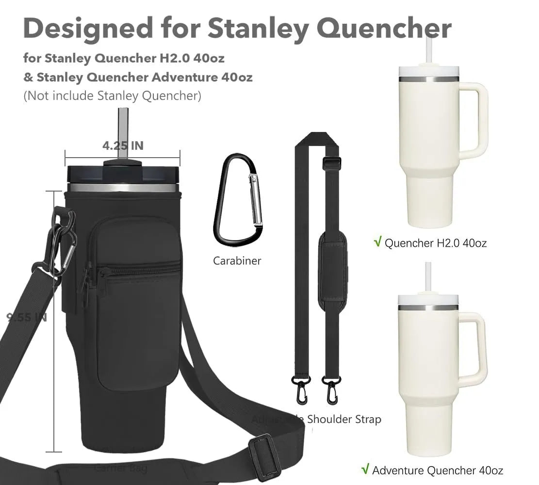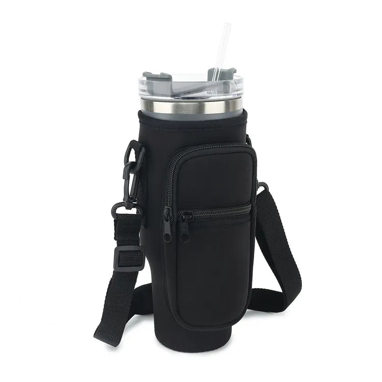 Our premium neoprene water bottle carrier bag is specially designed for the Stanley Quencher 40oz tumbler. With an adjustable strap, extra pockets, and durable protection, this sleeve makes carrying your cup easier, safer, and more stylish—perfect for outdoor adventures, gym, commuting, or daily use.