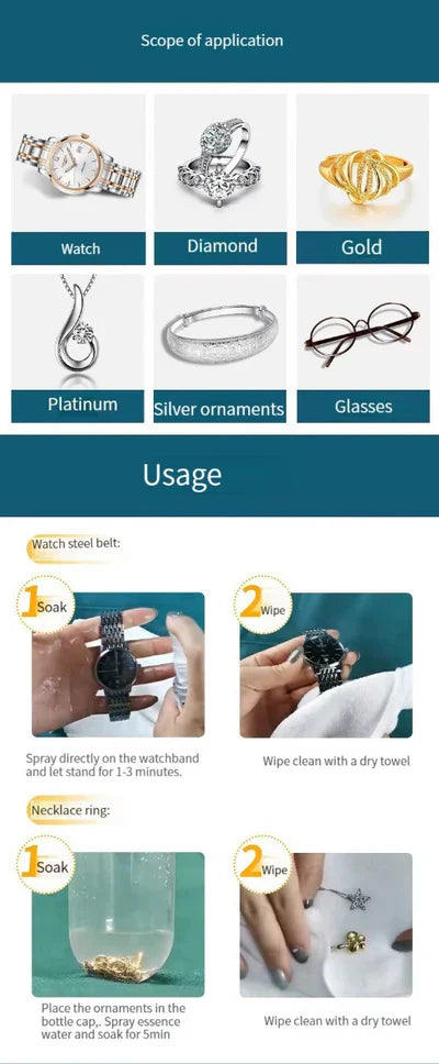 Our spray is suitable for a wide range of jewelry types, including gold, silver, platinum, and various gemstones. This all-in-one solution is your go-to for maintaining the shine and cleanliness of all your favorite accessories. 🛠️💫