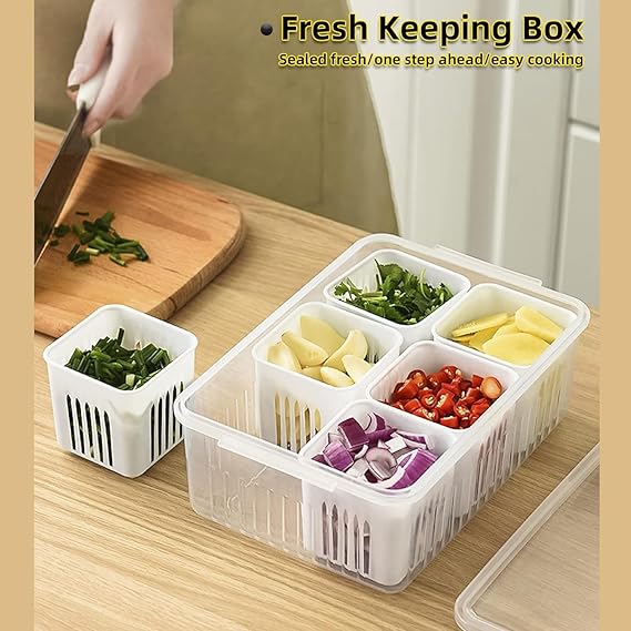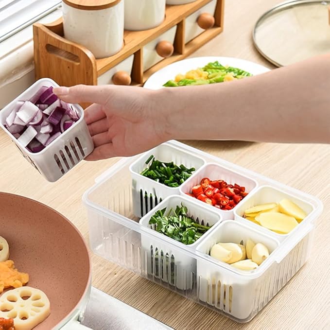 Tired of juggling multiple containers? 🧺 Our 6-in-1 storage box is your kitchen's new BFF! 💖 With dedicated spots for scallions, ginger, garlic, and onions, you'll have total org-zen! 🧘♀️
